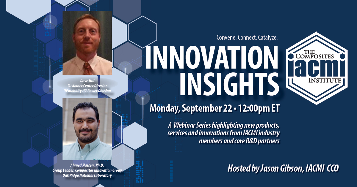 Our monthly webinar series “Innovation Insights” continues Monday, Sept. 22, at noon ET, as IACMI CCO Jason Gibson moderates discussions on recent technology advancements from IACMI members.